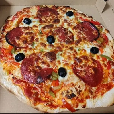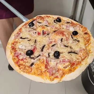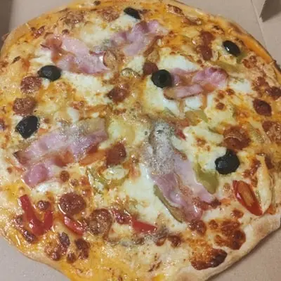 Base de crème et tomate, emmental, fromage de brebis, xistora, ventrèche fine, poivrons, olives
