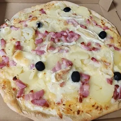 Crème, emmental, fromage à tartiflette, pommes de terre, lardons, oignons, origan, olives