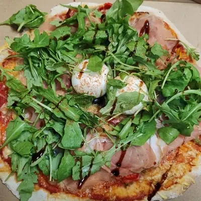 Piperade, emmental, burrata, jambon cru, roquette, crème de balsamique, olives