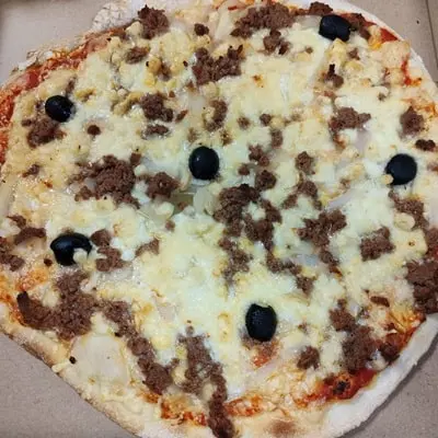 Tomate, emmental, mozzarella, oignons, viande hachée, olives