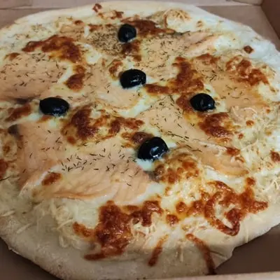 Crème, emmental, mozzarella, saumon fumé, aneth, olives