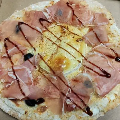 Crème, emmental, camembert, jambon cru, persillade, olives, piment d’ Espelette, balsamique